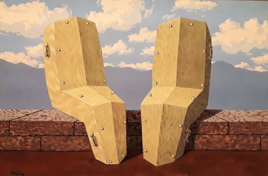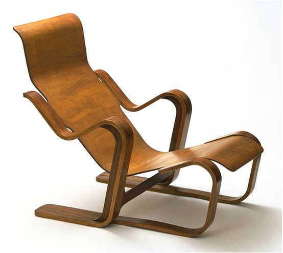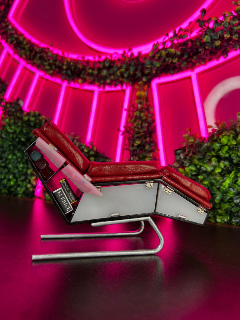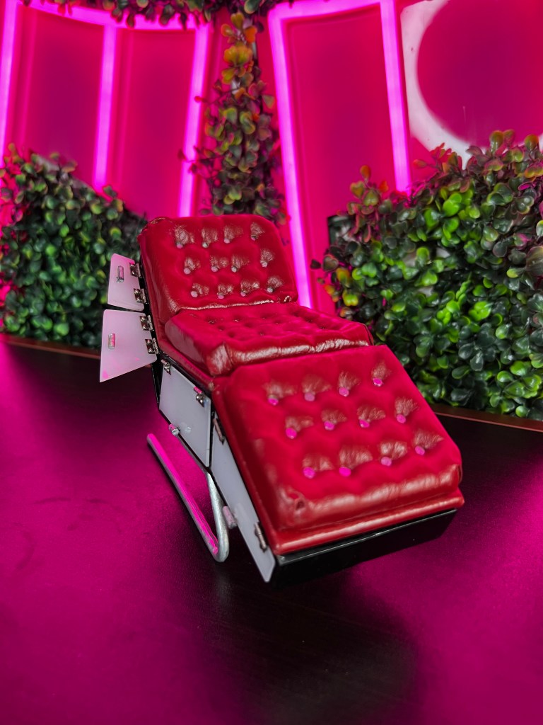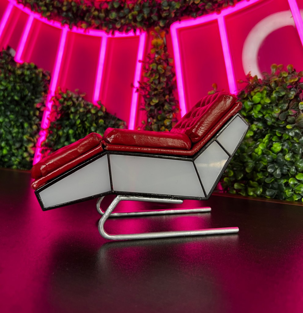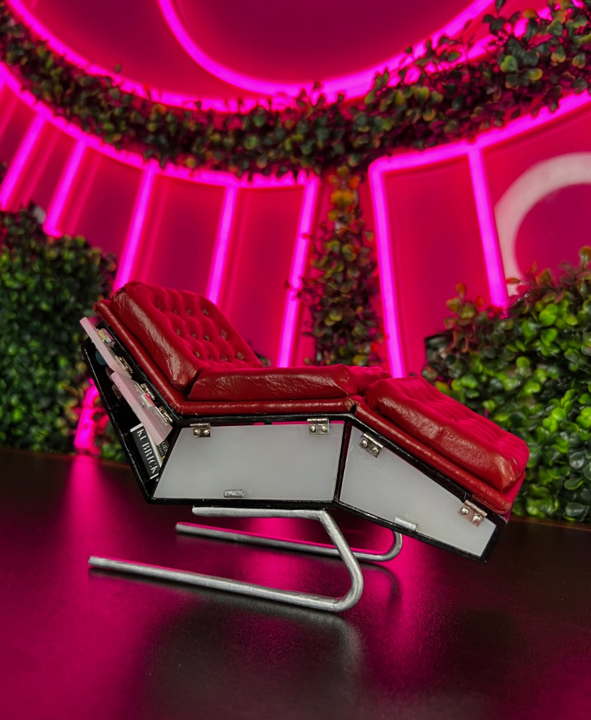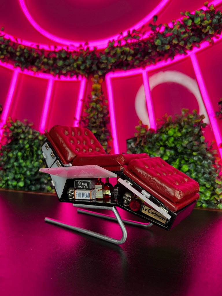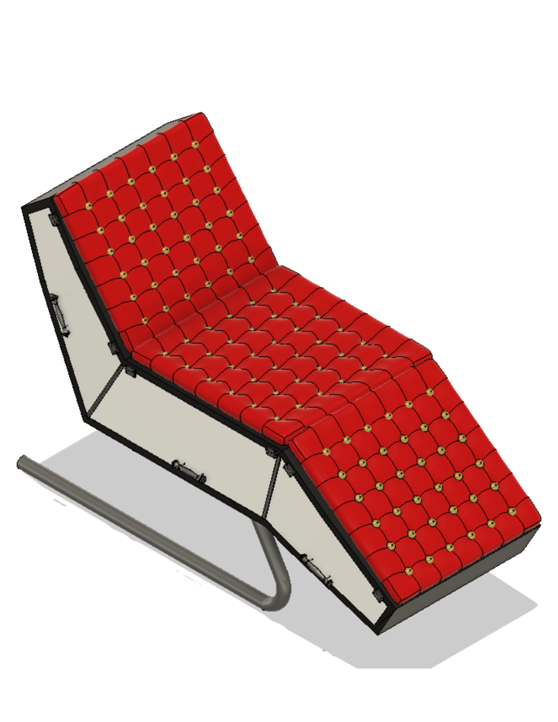 3D printed retro futuristic coffin shaped lounge chair inspired by Kubrick, Syd Mead, and Magritte.
