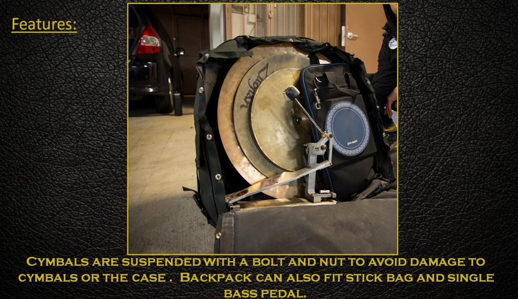 A Prototype cymbal backpack that suspends cymbals in “zero gravity” to allow maximum protection, and minimum wear on the case. This backpack carries all the tools a drummer needs that normally just go floating around random hardware bags and cases. This is the ultimate in road ready gear protection.